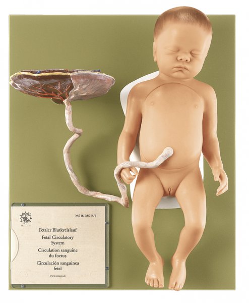 Natural size, in SOMSO-PLAST®. The model shows a female fetus at the end of the pregnancy with placenta and umbilical cord. Separates into 13 parts: placenta, umbilical cord, abdominal cover, lungs (2 parts), heart (2 parts), thymus, diaphragm, liver (2 parts), stomach and intestine, body. On a green base.